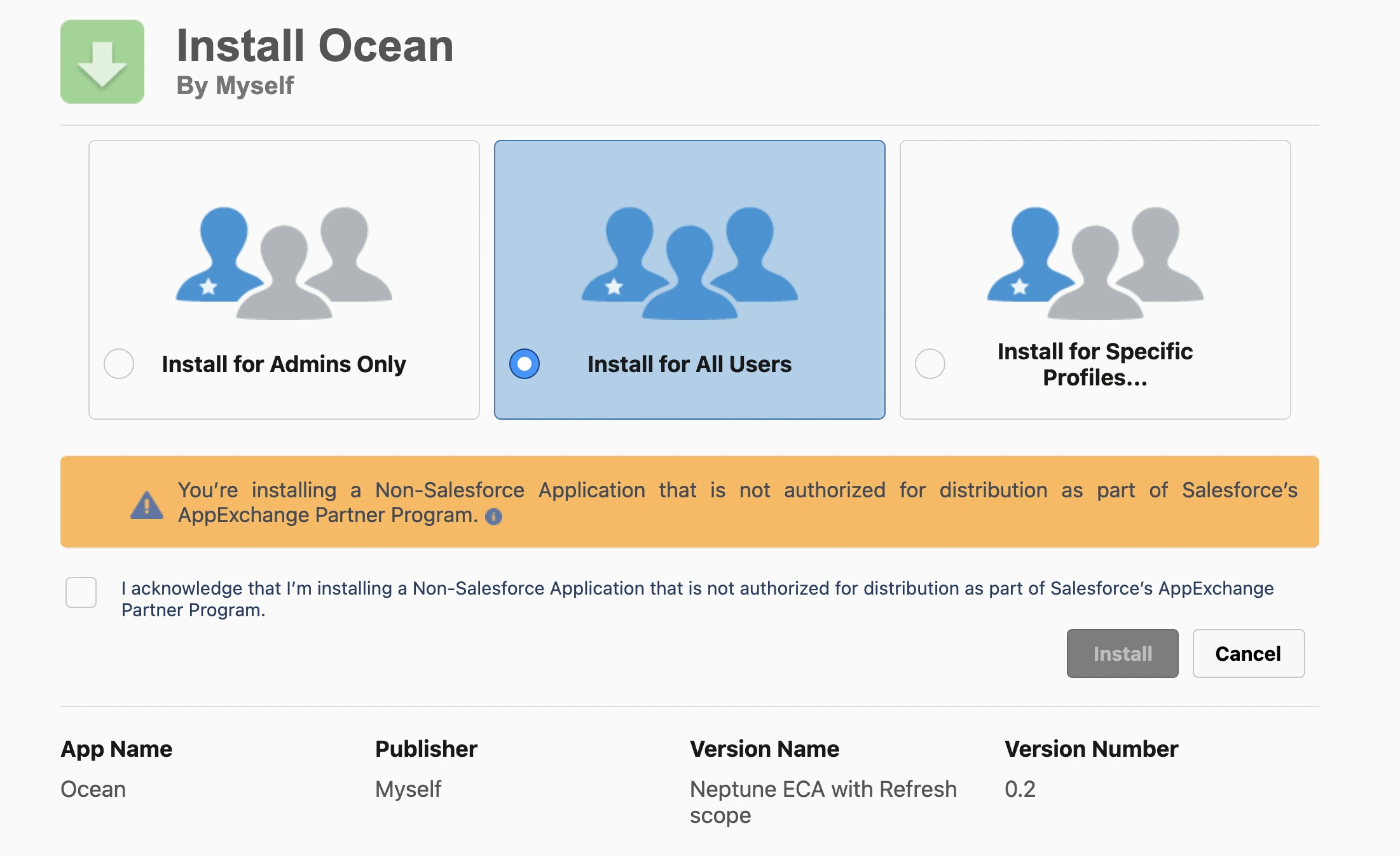 - Ask your customers to install the package. Instruct your customers to go to the package install URL and click “Install for All Users”. They must complete this step before connecting their Salesforce account using Ampersand’s prebuilt UI components. Otherwise OAuth will fail.