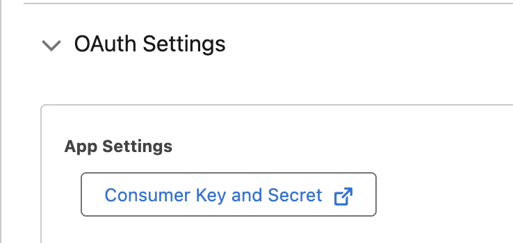 - Go to the Settings tab, expand “OAuth Settings”. Click on “Consumer Key and Secret”.